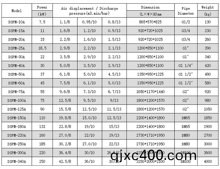 Technical parameters of of PM VSD screw air compressor